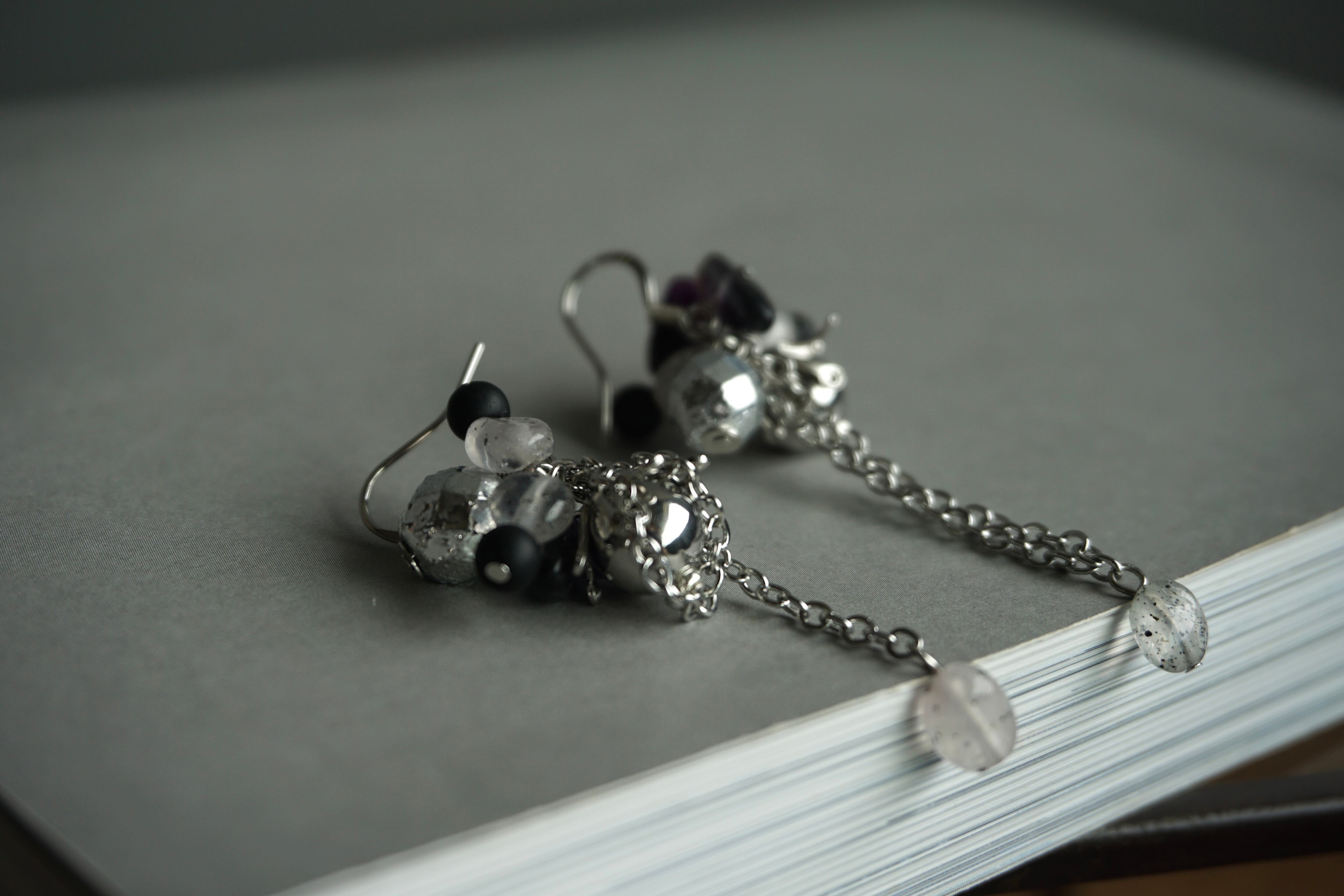 ステンレスのチェーン、フランス製のヴィンテージビーズでアシンメトリーに仕上げました。