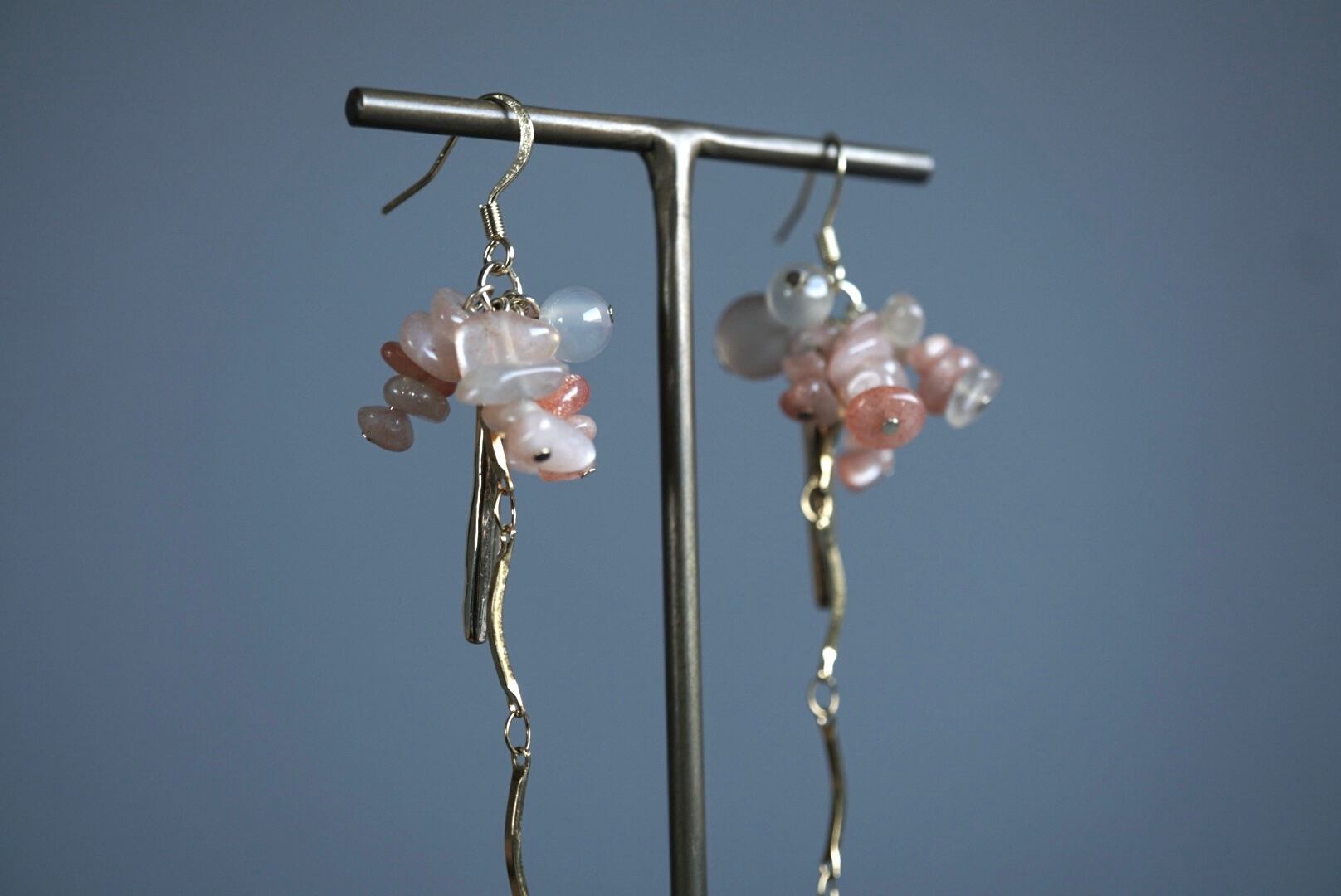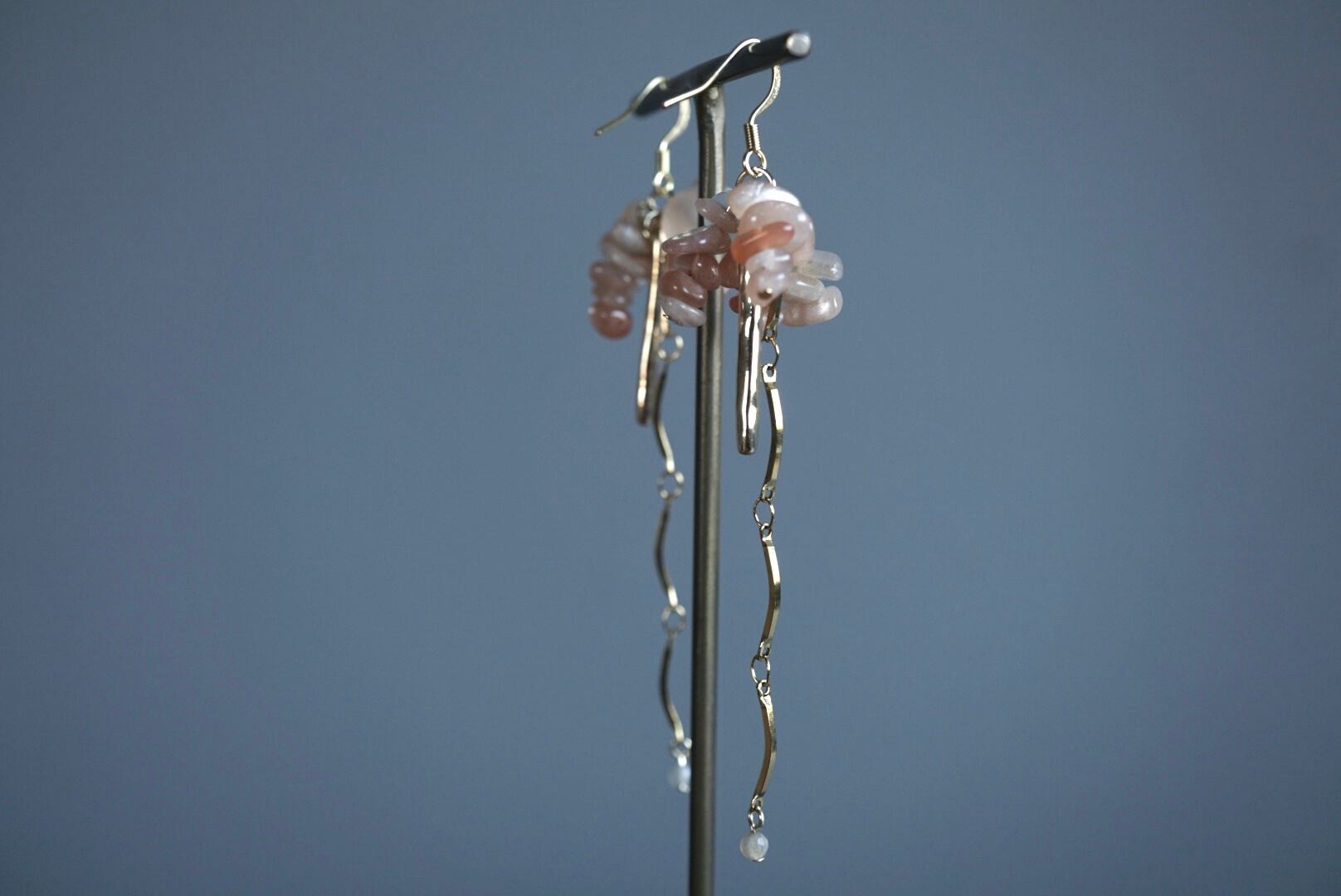 コーラルカラーのサンストーンをたっぷり用い、グレーアゲートを上下に忍ばせました。