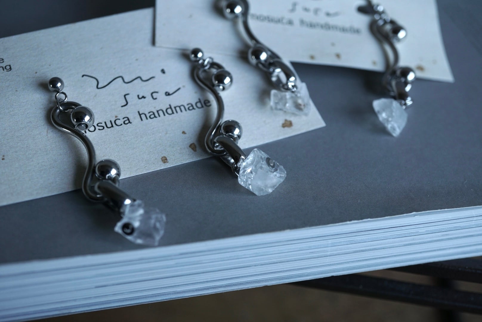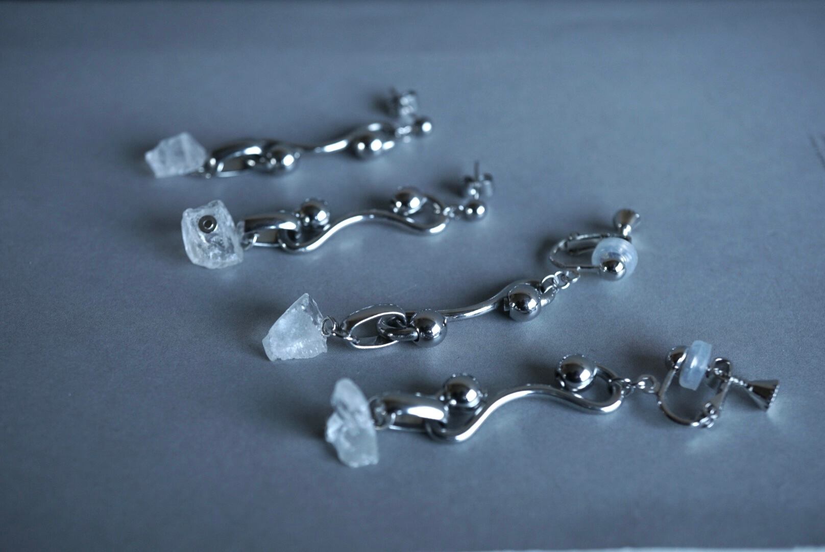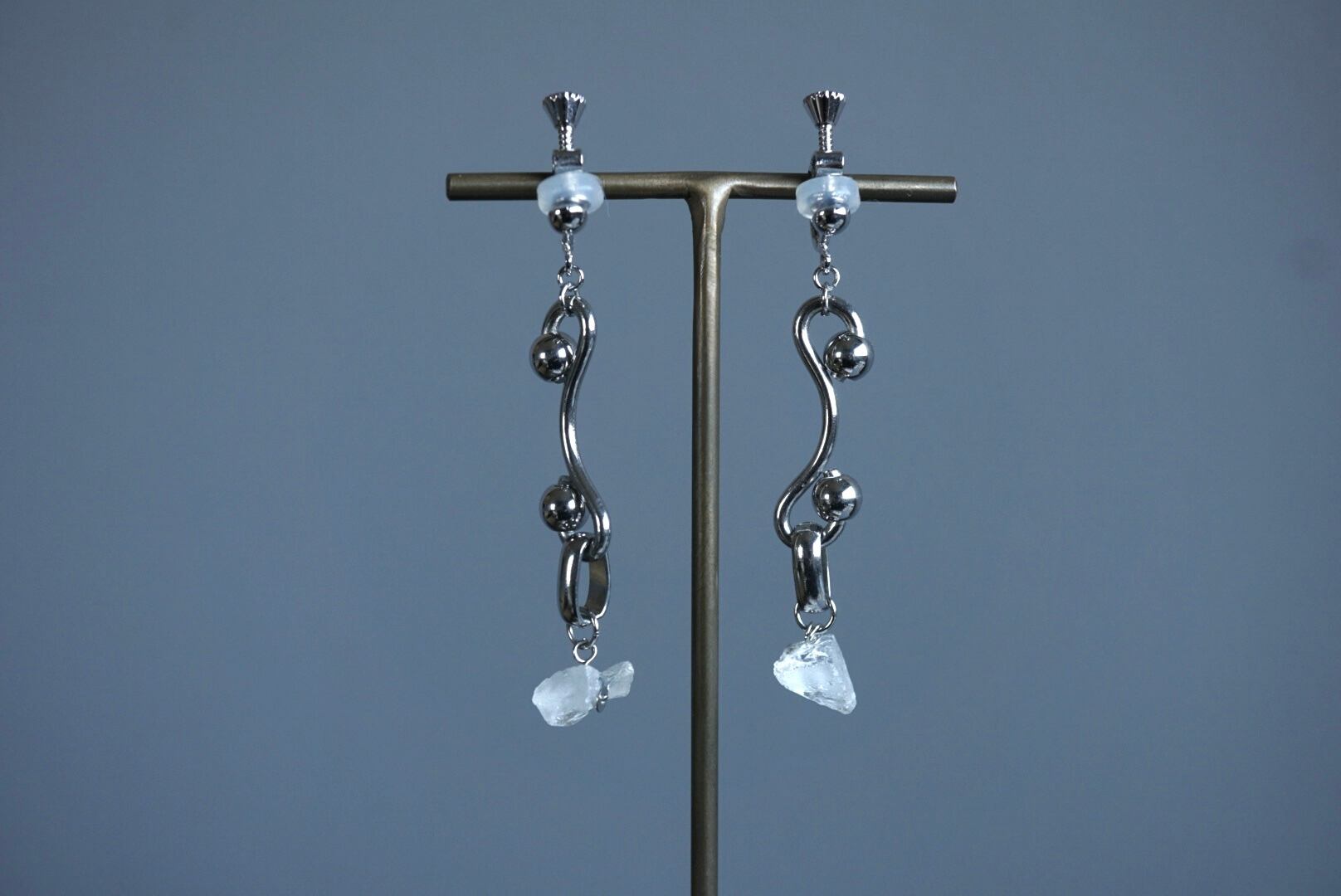 ユニークなステンレスチェーンとラフカットのクリスタルを合わせたイヤリング。